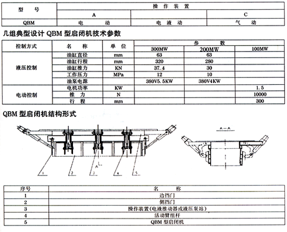 概 述 QBM型啟閉機(jī)安置在鍋爐渣井下部,在撈渣機(jī)正常工作時(shí),作爐底密封。在撈渣機(jī)旁出現(xiàn)保障,需檢修時(shí),關(guān)閉此門,作臨時(shí)儲(chǔ)渣及爐堂密封。 QBM型啟閉機(jī)由若干個(gè)部分組成。其安裝尺寸根據(jù)工況需求確定,關(guān)斷門與渣井之間采用螺栓連接,下部直接插入撈渣機(jī)水槽中。 QBM型啟閉機(jī)的操作控制有電液動(dòng)、電動(dòng)、氣動(dòng)方式。選用何種方式,定貨時(shí)請(qǐng)注明。